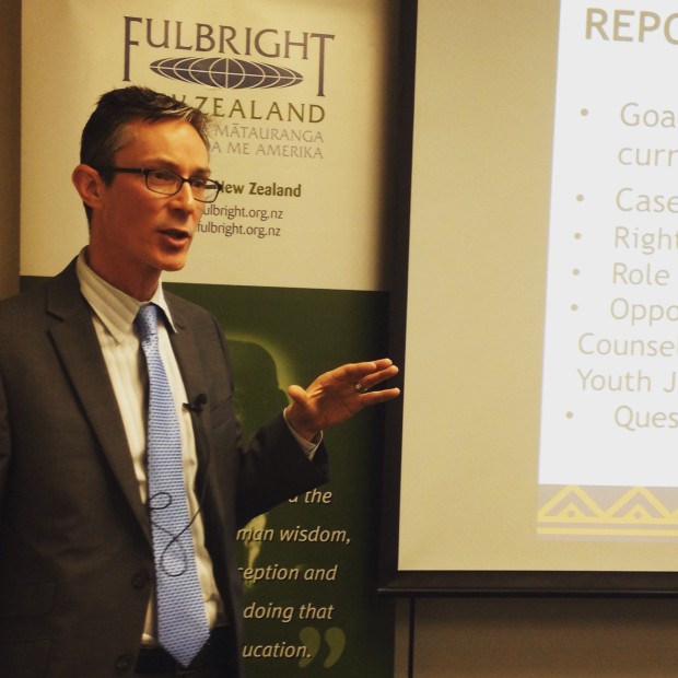2015 Ian Axford (New Zealand) Fellow Ziyad Hopkins, presenting his research on Diverted from Counsel: Filling the Rights Gap in New Zealand’s Youth Justice Model.